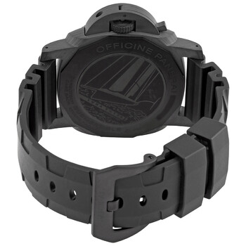 Black DLC titanium case with a black rubber strap. Uni-directional rotating coin edge black DLC titanium (carbotech) bezel. Black dial with black skeleton sword-shaped hands and dot hour markers. Dial Type: Analog. Luminescent hands and markers. Day of the week and date display at the 3 o'clock position. Small seconds sub-dial. Panerai calibre P.9010 automatic movement, containing 31 Jewels, composed of 200 parts, bitting at 28800 vph, and has a power reserve of approximately 72 hours. Scratch resistant sapphire crystal. Pull / push crown. Solid case back. Cushion case shape. Case size: 47 mm. Tang clasp. Water resistant at 30 meters / 100 feet. Functions: date, hour, minute, small second. Submersible Luna Rossa Series. Luxury watch style. Watch label: Swiss Made. Panerai Submersible Carbotech Luna Rossa Automatic Men's Watch PAM01039.
