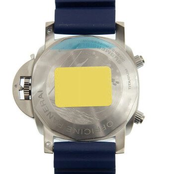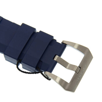 Grey titanium case with a blue rubber strap. Uni-directional rotating grey titanium bezel with an inlaid blue ceramic ring. Shark grey dial with luminous silver-tone hands and dot hour markers. Minute markers around the outer rim. Dial Type: Analog. Luminescent hands and markers. Panerai calibre P.9100 automatic movement, containing 37 Jewels, composed of 302 parts, bitting at 28800 vph, and has a power reserve of approximately 72 hours. Scratch resistant sapphire crystal. Pull / push crown. Solid case back. Cushion case shape. Case size: 47 mm. Band width: 26 mm / 22 mm. Tang clasp. Water resistant at 300 meters / 1000 feet. Functions: chronograph, column wheel, flyback, date, hour, minute, second. Submersible Chrono Guillaume Nery Edition Series. Dive watch style. Watch label: Swiss Made. Panerai Submersible Chrono Guillaume Nery Edition Chronograph Automatic Shark Grey Dial Men's 47 mm Watch PAM00982.