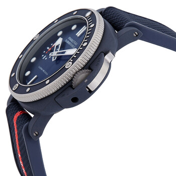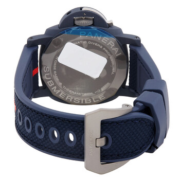 Blue ti-ceramitech case with a blue rubber strap. Uni-directional rotating blue ti-ceramitech bezel. Blue dial with silver-tone hands and batons hour markers. Minute markers around the outer rim. Dial Type: Analog. Luminescent hands and markers. Date display at the 3 o'clock position. One-small seconds at 9 o’clock subdials. Panerai Calibre P.900 Automatic movement, based upon Panerai OP XXXIV, containing 25 Jewels, bitting at 28800 vph, and has a power reserve of approximately 72 hours. Scratch resistant sapphire crystal. Screw down crown. Solid case back. Cushion case shape, case size: 44 mm. Pin buckle clasp. Water resistant at 500 meters / 1650 feet. Functions: date, hour, minute, small second. Submersible Quarantaquattro Series. Dive watch style. Watch label: Swiss Made. Panerai Submersible QuarantaQuattro Automatic Blue Dial Men's Watch PAM01466.
