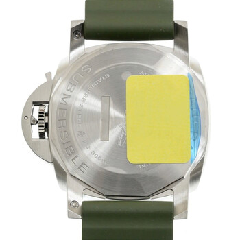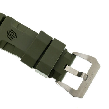 Stainless steel case with a military green rubber strap. Uni-directional rotating brushed stainless steel bezel. White dial with black hands and index hour markers. Minute markers around the outer rim. Dial Type: Analog. Luminescent hands and markers. Date display at the 3 o'clock position. One subdial displaying: one- small seconds. Panerai Calibre P.900 Automatic movement, based upon Panerai OP XXXIV, containing 25 Jewels, bitting at 28800 vph, and has a power reserve of approximately 72 hours. Scratch resistant sapphire crystal. Screw down crown. Solid case back. Cushion case shape, case size: 44 mm. Band length: 24.0/22.0 mm. Buckle clasp. Water resistant at 300 meters / 1000 feet. Functions: date, hour, minute, second. Submersible Quarantaquattro Series. Luxury watch style. Watch label: Swiss Made. Panerai Submersible QuarantaQuattro Automatic White Dial Men's Watch PAM01226.