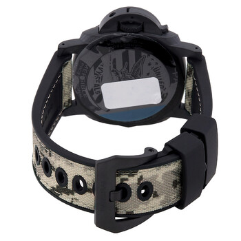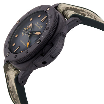 Black carbotech case with a camouflage textile and rubber strap. Uni-directional rotating black carbotech bezel. Black dial with black hands and index hour markers. Dial Type: Analog. Luminescent hands and markers. Date display at the 3 o'clock position. One subdial displaying: small second. Panerai Calibre P.900 Automatic movement, based upon Panerai OP XXXIV, containing 25 Jewels, bitting at 28800 vph, and has a power reserve of approximately 72 hours. Scratch resistant sapphire crystal. Screw down crown. Round case shape, case size: 44 mm. Buckle clasp. Water resistant at 500 meters / 1650 feet. Functions: date, hour, minute, small second. Submersible Quarantaquattro Series. Dive watch style. Watch label: Swiss Made. Panerai Submersible QuarantaQuattro Carbotech Automatic Black Dial Watch PAM01513.