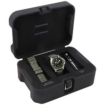 Silver-tone brushed stainless steel case with a green fabric strap. Green polished gradient dial with silver-tone hands and index hour markers. Dial Type: Analog. Luminescent hands and markers. Date display at the 3 o'clock position. One subdial displaying: one- small seconds. Panerai Calibre P.900 Automatic movement, based upon Panerai OP XXXIV, containing 25 Jewels, bitting at 28800 vph, and has a power reserve of approximately 72 hours. Scratch resistant sapphire crystal. Screw down crown. Solid case back. Cushion case shape, case size: 44 mm. Band width: 24/22 mm. Water resistant at 300 meters / 1000 feet. Functions: date, hour, minute, second. Submersible Quarantaquattro Esteel Series. Luxury watch style. Watch label: Swiss Made. Panerai Submersible QuarantaQuattro eSteel Automatic Men's Watch PAM01287.