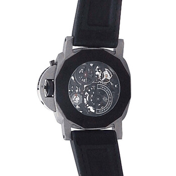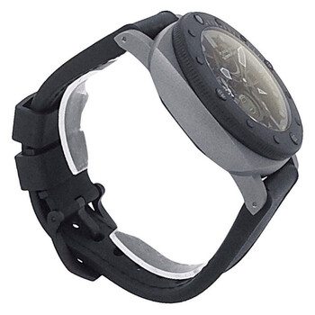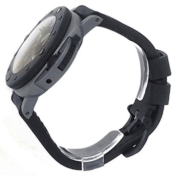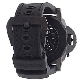 Black ceramic case with a black rubber strap. Uni-directional rotating black rubber bezel. Transparent dial with black hands and index hour markers. Minute markers around the outer rim. Dial Type: Analog. Luminescent hands and markers. Date display at the 3 o'clock position. One subdial displaying: 24 hour. Panerai Calibre P.4001 Automatic movement, containing 31 Jewels, composed of 278 parts, bitting at 28800 vph, and has a power reserve of approximately 72 hours. Scratch resistant sapphire crystal. Screw down crown. Transparent see through case back. Round case shape, case size: 47 mm. Buckle clasp. Water resistant at 300 meters / 1000 feet. Functions: date, GMT, second time zone, hour, minute, small second, power reserve indicator. Submersible S Brabus Series. Dive watch style. Watch label: Swiss Made. Panerai Submersible S Brabus GMT Automatic Men's Watch PAM01241.