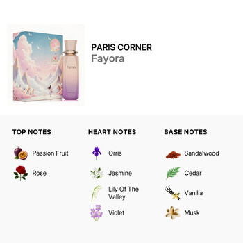 Fayora opens with a vibrant blend of passion fruit and rose, creating a sweet and floral introduction that immediately captivates the senses. As the fragrance unfolds, the heart reveals a sophisticated bouquet of orris, jasmine, lily of the valley, and violet—each note adding depth and grace to the scent. The experience is beautifully rounded out with warm base notes of sandalwood, cedar, vanilla, and musk, delivering a soft, lasting finish that stays with you throughout the day.