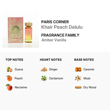 From the first spray, Khair Peach Delulu wraps you in a juicy mix of guava, peach, and nectarine — a trio that feels like sunshine in a bottle. As the fragrance settles, hints of spicy ginger and aromatic cardamom add a touch of boldness, creating a perfect contrast to the sweetness. Finally, the scent dries down to a cozy blend of caramel, musk, and dry wood, leaving a lasting impression that’s soft, sensual, and unforgettable.