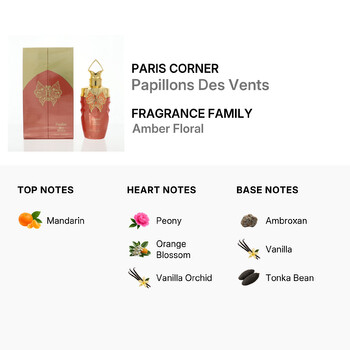 At first spritz, Papillons Des Vents greets you with a sparkling top note of juicy mandarin that adds a fresh and vibrant opening. As the fragrance unfolds, heart notes of delicate peony, sweet orange blossom, and exotic vanilla orchid bloom, wrapping you in a bouquet of floral sophistication. Finally, the base reveals a warm and creamy blend of ambroxan, vanilla, and tonka bean, leaving a sensual trail that's both comforting and captivating.