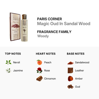 Belonging to the rich and timeless Woody fragrance family, Magic Oud In Sandal Wood opens with bright, floral top notes of neroli and jasmine that awaken the senses with a splash of fresh elegance. The heart blooms with a warm, inviting blend of peach, rose, and a sprinkle of cinnamon, creating a sweet yet spicy core that feels both comforting and adventurous. As the scent settles, it unveils a luxurious base of sandalwood, leather, amber, oud, and musks, wrapping you in a creamy, smoky embrace that lingers long after you've left the room.