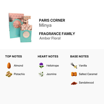 Minya opens with a delightful blend of almond and pistachio, creating a warm and nutty introduction that instantly draws you in. As the fragrance unfolds, a soft heart of heliotrope and jasmine adds a floral sweetness that feels both fresh and luxurious. The base lingers with the comforting richness of vanilla, salted caramel, and sandalwood, leaving a smooth and lasting impression that’s both cozy and refined.