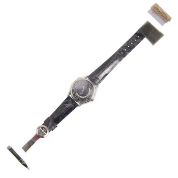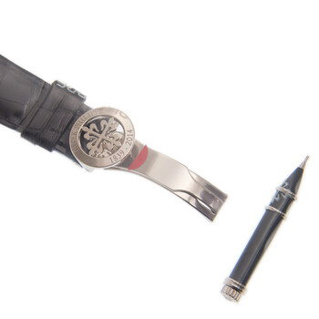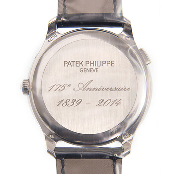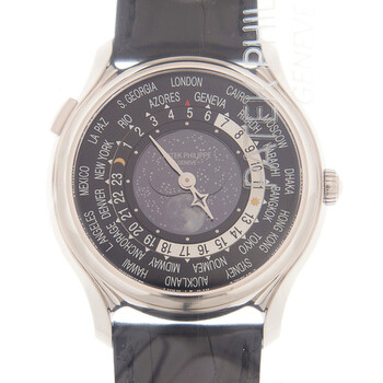 18kt white gold case with a black alligator leather strap. Fixed 18kt white gold 18kt white gold bezel. Black dial with gold-tone hands and Arabic numeral hour markers. World markers around the outer rim. Dial Type: Analog. Moon phase. Moon phase subdials. Patek Philippe Calibre 240 HU LU Automatic movement, based upon 240 HU, containing 35 Jewels, composed of 270 parts, bitting at 21600 vph, and has a power reserve of approximately 48 hours. Scratch resistant sapphire crystal. Screw down crown. Transparent case back. Round case shape, case size: 39.8 mm, case thickness: 10.25 mm. Band width: 20 mm. Deployment clasp. Water resistant at 30 meters / 100 feet. Functions: moon phase, world time, GMT, hour, minute, day/night indicator. Additional Info: original box, international warranty card, manual (complete accessories). Travel watch style. Watch label: Swiss Made. Patek Philippe Anniversary Series World Time Moon Automatic Black Dial Watch 5575G-001.