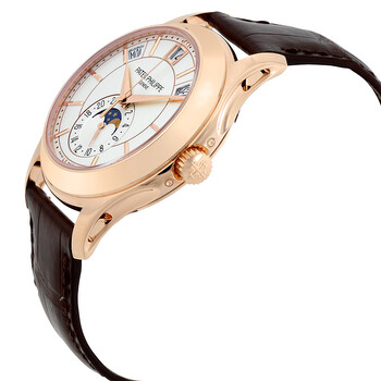 18kt rose gold case with a brown alligator leather strap. Fixed 18kt rose gold bezel. Opaline white dial with rose gold dauphine-style shape hands and Roman numeral hour markers. Minute markers around the outer rim. Dial Type: Analog. Day of the week display. date display. month display. One subdial displaying: moon phase/24 hour. Patek Philippe Calibre 324 S QA LU 24H/206 Automatic movement, containing 34 Jewels, composed of 356 parts, bitting at 28800 vph, and has a power reserve of approximately 45 hours. Scratch resistant sapphire crystal. Transparent case back. Round case shape, case size: 40 mm, case thickness: 11.36 mm. Band width: 20.3 mm, band length: 8 inches. Tang clasp. Water resistant at 30 meters / 100 feet. Functions: annual calendar, moon phase, month, date, day, GMT, second time zone, hour, minute, second. Additional Info: unsuitable for prolonged contact with water e.g. swimming, bathing. Annual Calendar Series. Luxury watch style. Watch label: Swiss Made. Item Variations: 5205R 001, 5205R.001, 5205R001. Patek Philippe Annual Calendar Opaline White Dial Brown Leather Men's Watch 5205R-001.