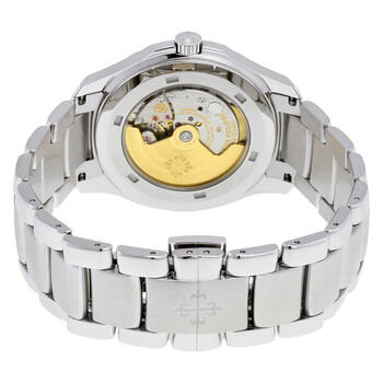 Silver-tone stainless steel case with a silver-tone stainless steel bracelet. Fixed silver-tone stainless steel bezel. Black dial with luminous hands and Arabic hour markers. Minute markers around the outer rim. Dial Type: Analog. Luminescent hands and markers. Date display at the 3 o'clock position. Patek Philippe Calibre 324 S C Automatic movement, containing 29 Jewels, composed of 213 parts, bitting at 28800 vph, and has a power reserve of approximately 45 hours. Scratch resistant sapphire crystal. Screw down crown. Transparent see through case back. Cushion case shape, case size: 40 mm x 40 mm. Fold over with push button release clasp. Water resistant at 120 meters / 400 feet. Functions: date, hour, minute, second. Aquanaut Series. Luxury watch style. Watch label: Swiss Made. Patek Philippe Aquanaut Black Dial Stainless Steel Automatic Men's Watch 5167-1A.
