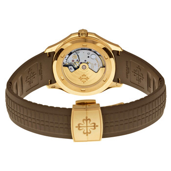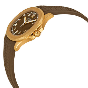 18kt rose gold case with a brown rubber strap. Fixed 18kt rose gold bezel. Brown dial with luminous rose gold hands and Arabic numeral hour markers. Minute markers around the outer rim. Dial Type: Analog. Luminescent hands and markers. Date display at the 3 o'clock position. Patek Philippe calibre 324 S C automatic movement, containing 29 Jewels, composed of 213 parts, bitting at 28800 vph, and has a power reserve of approximately 45 hours. Scratch resistant sapphire crystal. Screw down crown. Transparent case back. Cushion case shape. Case size: 40 mm. Fold over clasp with a push button release. Water resistant at 120 meters / 400 feet. Functions: date, hour, minute, second. Aquanaut Series. Dress watch style. Watch label: Swiss Made. Item Variations: 5167R 001, 5167R.001, 5167R001. Patek Philippe Aquanaut Brown Dial 18k Rose Gold Brown Rubber Automatic Men's Watch 5167R-001.