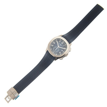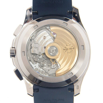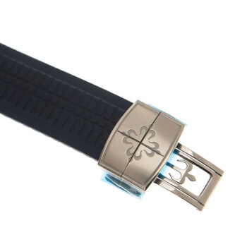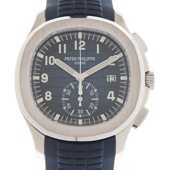 18kt white gold case with a blue rubber strap. Fixed 18kt white gold bezel. Blue dial with Arabic numeral hour markers. Dial Type: Analog. Date display at the 3 o'clock position. Patek Philippe Calibre CH 28-520 C Automatic movement, containing 35 Jewels, composed of 327 parts, bitting at 28800 vph, and has a power reserve of approximately 55 hours. Scratch resistant sapphire crystal. Screw down crown. Transparent see through case back. Cushion case shape, case size: 42.2 mm, case thickness: 11.9 mm. Deployment clasp. Water resistant at 120 meters / 400 feet. Functions: date, hour, minute, second. Additional Info: original box, international warranty card, manual (complete accessories). Aquanaut Series. Luxury watch style. Watch label: Swiss Made. Patek Philippe Aquanaut Automatic Blue Dial Men's Watch 5968G-001.