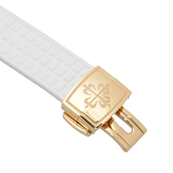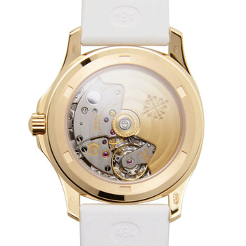18kt rose gold case set with 46 (1 ct.) diamonds case with a white rubber strap. Fixed 18kt rose gold bezel with diamond set. White dial with gold-tone hands and Arabic numeral hour markers. Minute markers around the outer rim. Dial Type: Analog. Date display at the 3 o'clock position. Patek Philippe Calibre 324 S C Automatic movement, containing 29 Jewels, composed of 213 parts, bitting at 28800 vph, and has a power reserve of approximately 45 hours. Scratch resistant sapphire crystal. Transparent case back. Cushion case shape, case size: 35.6 mm, case thickness: 8.5 mm. Fold over clasp. Water resistant at 120 meters / 400 feet. Functions: hours, minutes, seconds, date. Aquanaut Luce Series. Luxury watch style. Watch label: Swiss Made. Patek Philippe Aquanaut Luce Automatic Diamond White Dial Ladies Watch 5068R-010.