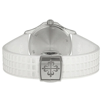 Stainless steel case with a white rubber strap. Fixed bezel set with diamonds. White dial with silver-tone hands and Arabic numerals hour markers. Dial Type: Analog. Luminescent hands and markers. Date at 3 o'clock position. Quartz movement. Caliber e 23-250 s c engine. Scratch resistant sapphire crystal. Screw-down crown. Solid case back. Case diameter: 36.3mm x 34mm. Cushion case shape. Fold-over clasp. Water resistant at 120 meters / 400 feet. Functions: hour, minute, second, date. Additional Info: case set with 46 diamonds (~1 ct.), embossed dial, "tropical" composite strap. Luxury watch style. Patek Philippe Aquanaut Luce Pure White Ladies Watch 5067A-011.