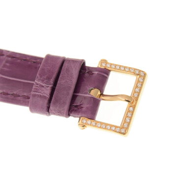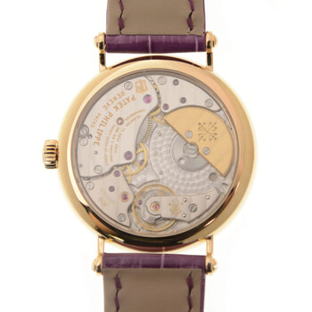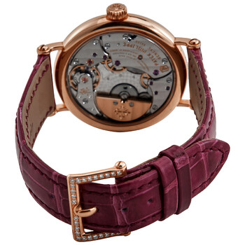 Rose gold-tone 18kt rose gold case with a purple alligator band. Fixed rose gold-tone bezel with 18kt rose gold 142 diamond set (~1.08 ct). Silvery grained dial with rose gold-tone spade-shaped hands and Arabic numeral hour markers. Minute markers around the outer rim. Dial Type: Analog. Patek Philippe Calibre 240 Automatic movement, containing 27 Jewels, composed of 161 parts, bitting at 21600 vph, and has a power reserve of approximately 48 hours. Scratch resistant sapphire crystal. Screw down crown. Transparent case back. Round case shape, case size: 34.6 mm, case thickness: 7.37 mm. Prong buckle 26 diamond set (~0.18 ct) clasp. Water resistant at 30 meters / 100 feet. Functions: hour, minute. Calatrava Series. Luxury watch style. Watch label: Swiss Made. Patek Philippe Calatrava Automatic Diamond Ladies Watch 7200-200R-001.