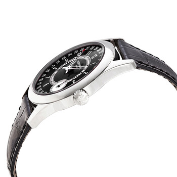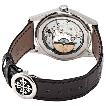 18kt white gold case with a black alligator leather strap. Fixed 18kt white gold bezel. Black sunburst dial with white hands and Arabic numeral hour markers. Date markers around the outer rim. Dial Type: Analog. Pointer date. One- small seconds subdials. Patek Philippe Calibre 240 PS C Automatic movement, based upon Patek Philippe 240, containing 27 Jewels, composed of 191 parts, bitting at 21600 vph, and has a power reserve of approximately 48 hours. Scratch resistant sapphire crystal. Transparent case back. Round case shape, case size: 39 mm, case thickness: 8.86 mm. Fold over clasp. Water resistant at 30 meters / 100 feet. Functions: date, hour, minute, second. Luxury watch style. Watch label: Swiss Made. Patek Philippe Calatrava Automatic Men's 18kt White Gold Watch 6006G-001.
