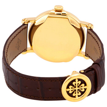 18kt yellow gold case with a brown alligator leather strap. Fixed 18kt yellow gold bezel. Silvery opaline dial with yellow gold hands and index hour markers. Minute markers around the outer rim. Dial Type: Analog. Date display appears at the 3 o'clock position. Automatic movement with a 42 hour power reserve. Scratch resistant sapphire crystal. Pull / push crown. Skeleton case back. Case diameter: 38 mm. Case thickness: 10 mm. Round case shape. Band width: 20.3 mm. Band length: 8 inches. Fold over clasp with safety release. Water resistant at 30 meters / 100 feet. Functions: date, hour, minute, second. Luxury watch style. Watch label: Swiss Made. Patek Philippe Calatrava Automatic Opaline Dial 18 kt Yellow Gold Men's Watch 5153J.