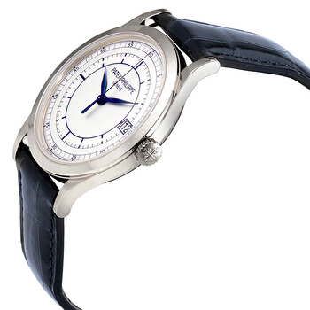 18kt white gold case with a blue alligator leather strap. Fixed 18kt white gold bezel. Silver dial with blue hands and stick hour markers. Minute markers around the outer rim. Dial Type: Analog. Date display appears at the 3 o'clock position. Automatic movement with a 45-hour power reserve. Scratch resistant sapphire crystal. Skeleton case back. Case diameter: 38 mm. Case thickness: 8.6 mm. Round case shape. Tang clasp. Water resistant at 25 meters / 80 feet. Functions: date, hour, minute, second. Luxury watch style. Patek Philippe Calatrava Automatic Silver Dial 18 kt White Gold Men's Watch 5296G-001. for a list of Patek Movements. http://www.patek.com/pdf/instructionsforuse/PatekPhilippe_P767_Calibres_automatiques_2013.pdf