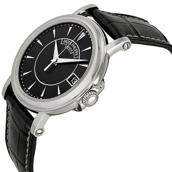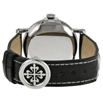 18kt white gold case with a black alligator leather strap. Fixed 18k white gold bezel. Black dial with white gold dauphine-style shape hands and index hour markers. Minute markers around the outer rim. Dial Type: Analog. Date display at the 3 o'clock position. Patek Philippe Calibre 324 S C Automatic movement, containing 29 Jewels, composed of 213 parts, bitting at 28800 vph, and has a power reserve of approximately 45 hours. Scratch resistant sapphire crystal. Pull / push crown. Skeleton case back. Round case shape. Case size: 38 mm. Band width: 20.3 mm, band length: 8 inches. Deployment clasp. Water resistant at 30 meters / 100 feet. Functions: date, hour, minute, second. Luxury watch style. Watch label: Swiss Made. Item Variations: 5153G 001, 5153G.001, 5153G001. Patek Philippe Calatrava Black Dial 18k White Gold Black Leather Men's Watch 5153G-001.