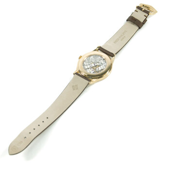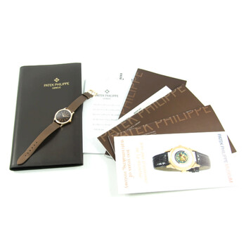 18kt rose gold case with a brown satin strap. Fixed 18kt rose gold diamond set bezel. Brown dial with gold-tone dauphine-style shape hands and index hour markers. Dial Type: Analog. Patek Philippe Calibre 215 Hand Wind movement, containing 18 Jewels, composed of 130 parts, bitting at 28800 vph, and has a power reserve of approximately 44 hours. Scratch resistant sapphire crystal. Screw down crown. Transparent case back. Round case shape. Case size: 33 mm. Tang clasp. Water resistant at 30 meters / 100 feet. Functions: hour, minute. Additional Info: bezel set with 72 diamonds (~0.47 ct.). Luxury watch style. Watch label: Swiss Made. Patek Philippe Calatrava Hand Wind Diamond Brown Dial Ladies Watch 4897R-001.