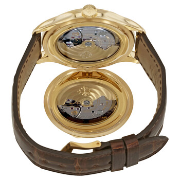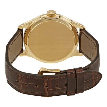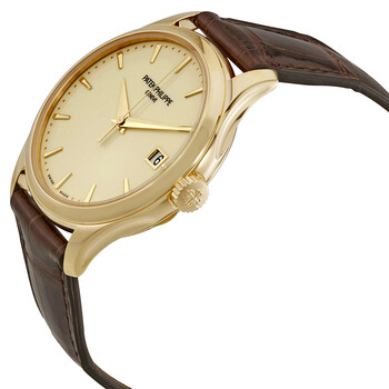 18kt yellow gold case with a brown (alligator) leather strap. Fixed 18kt yellow gold bezel. Ivory dial with yellow gold-tone dauphine-style hands and index hour markers. Minute markers around the outer rim. Dial Type: Analog. Date display at the 3 o'clock position. Patek Philippe calibre 324 S C automatic movement, containing 29 Jewels, composed of 213 parts, bitting at 28800 vph, and has a power reserve of approximately 45 hours. Scratch resistant sapphire crystal. Push / pull crown. Sapphire crystal case back protected by an invisibly-hinged dust cover. Round case shape. Case size: 39 mm. Tang clasp. Water resistant at 30 meters / 100 feet. Functions: date, hour, minute, second. Luxury watch style. Watch label: Swiss Made. Item Variations: 5227J. Patek Philippe Calatrava Ivory Dial 18kt Yellow Gold Brown Leather Men's Watch 5227J-001.