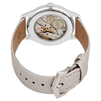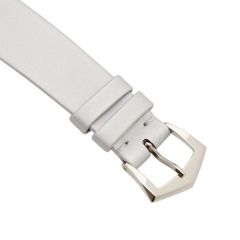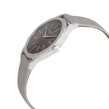 18kt white gold case with a silvery grey satin strap. Fixed 18kt white gold bezel set with 72 diamonds. Guilloched silvery gray dial with silver-tone dauphine-style hands and index hour markers. Dial Type: Analog. Patek Philippe Calibre 215 Hand Wind movement, containing 18 Jewels, composed of 130 parts, bitting at 28800 vph, and has a power reserve of approximately 44 hours. Scratch resistant sapphire crystal. Pull / push crown. Transparent case back. Round case shape. Case size: 33 mm. Tang clasp. Water resistant at 30 meters / 100 feet. Functions: hour, minute. Additional Info: bezel set with 72 diamonds (~0.47 ct.). Calatrava Series. Luxury watch style. Watch label: Swiss Made. Patek Philippe Calatrava Ladies Hand Wound Watch 4897G-010.