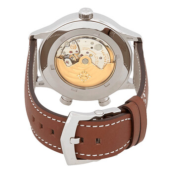 18kt white gold case with a brown calfskin leather strap. Fixed white 18kt white gold bezel. Blue varnished dial with luminous sword-shaped hands and Arabic numeral hour markers. Minute markers around the outer rim. Dial Type: Analog. Luminescent hands and markers. Date display at the 6 o'clock position. Date sub-dial. Patek Philippe calibre 324 S C FUS automatic movement, containing 29 Jewels, composed of 294 parts, bitting at 28800 vph, and has a power reserve of approximately 45 hours. Scratch resistant sapphire crystal. Screw locked crown. Transparent case back. Round case shape. Case size: 42 mm. Tang clasp. Water resistant at 60 meters / 200 feet. Functions: date, second time zone, hour, minute, second, day/night indicator. Pilot watch style. Watch label: Swiss Made. Patek Philippe Calatrava Pilot Travel Time Automatic Men's Watch 5524G-001.