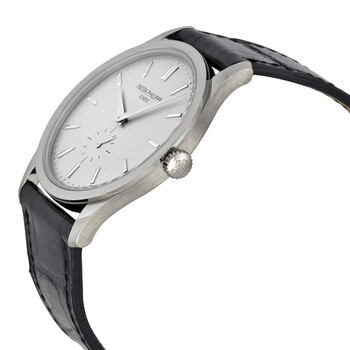 18kt white gold case with a black alligator leather strap. Fixed 18kt white gold bezel. Silver grey dial with silver-tone dauphine-style shape hands and index hour markers. Minute markers around the outer rim. Dial Type: Analog. Small seconds subdials. Patek Philippe Calibre 215 PS Hand Wind movement, based upon Patek Philippe 215, containing 18 Jewels, bitting at 28800 vph, and has a power reserve of approximately 44 hours. Scratch resistant sapphire crystal. Pull / push crown. Solid case back. Round case shape, case size: 37 mm, case thickness: 8 mm. Tang clasp. Water resistant at 30 meters / 100 feet. Functions: hour, minute, small second. Luxury watch style. Watch label: Swiss Made. Patek Philippe Calatrava Silver Dial 18 kt White Gold Men's Watch 5196G/001.