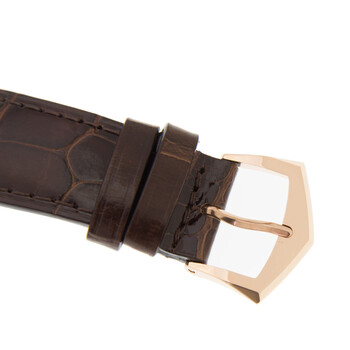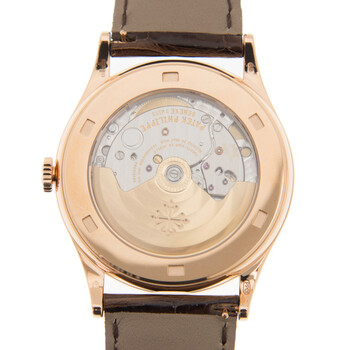 18kt rose gold case with a brown (alligator) leather strap. Fixed 18kt rose gold bezel. Silvery gray dial with blue leaf-style hands and index hour markers. Arabic numeral minute markers (at 5 minute intervals). Minute markers around the outer rim. Dial Type: Analog. Date display at the 3 o'clock position. Patek Philippe calibre 324 S C automatic movement, containing 29 Jewels, composed of 213 parts, bitting at 28800 vph, and has a power reserve of approximately 45 hours. Scratch resistant sapphire crystal. Pull / push crown. Transparent case back. Round case shape. Case size: 38 mm. Tang clasp. Water resistant at 30 meters / 100 feet. Functions: date, hour, minute, second. Calatrava Series. Luxury watch style. Watch label: Swiss Made. Item Variations: 5296R 001, 5296R.001, 5296R001. Patek Philippe Calatrava Silvery Gray Dial 18kt Rose Gold Men's Watch 5296R-001.