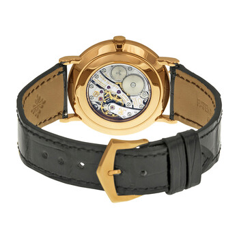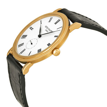 18kt rose gold case with a black (alligator) leather strap. Fixed hobnail-patterned 18kt rose gold bezel. White dial with black leaf-style hands and Roman numeral hour markers. Dial Type: Analog. Seconds sub-dial at the 6 o'clock position. Patek Philippe calibre 215 PS hand wind movement with a 44-hour power reserve. Scratch resistant sapphire crystal. Fluted pull / push crown. Sapphire crystal case back. Round case shape. Case size: 36 mm. Case thickness: 6.5 mm. Band width: 20.3 mm. Band length: 8 inches. Deployment clasp. Water resistant at 30 meters / 100 feet. Functions: hour, minute, small second. Luxury watch style. Watch label: Swiss Made. Item Variations: 5119R. Patek Philippe Calatrava White Dial 18kt Rose Gold Men's Watch 5119R.