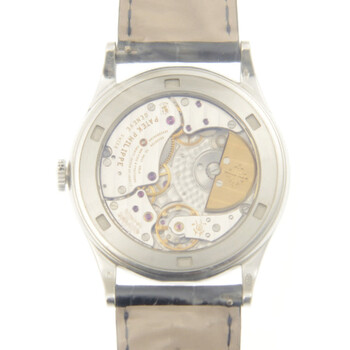 White platinum case with a black alligator band. Fixed white platinum bezel. White dial with white dauphine-style shape hands. Dial Type: Analog. Patek Philippe Calibre 240 Automatic movement, containing 27 Jewels, composed of 161 parts, bitting at 21600 vph, and has a power reserve of approximately 48 hours. Scratch resistant sapphire crystal. Transparent see through case back. Round case shape, case size: 37 mm. Functions: hour, minute. Additional Info: original box, international warranty card, manual (complete accessories). Calatrava Series. Luxury watch style. Watch label: Swiss Made. Patek Philippe CALATRAVA White Dial Unisex Watch 5077P-053.