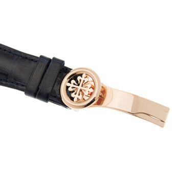 Gold-tone 18kt rose gold case with a blue alligator leather strap. Fixed 18kt rose gold bezel. Blue dial with gold-tone hands and index hour markers. Minute markers around the outer rim. Dial Type: Analog. Annual calendar. One subdial displaying: moon phase/24 hour. Patek Philippe Calibre 324 S QA LU 24H/206 Automatic movement, containing 34 Jewels, composed of 356 parts, bitting at 28800 vph, and has a power reserve of approximately 45 hours. Scratch resistant sapphire crystal. Screw down crown. Transparent case back. Round case shape, case size: 38.5 mm, case thickness: 11 mm. Deployment clasp. Water resistant at 30 meters / 100 feet. Functions: annual calendar, moon phase, month, date, day, GMT, second time zone, hour, minute, second. Additional Info: original box, international warranty card, manual (complete accessories). Complications Series. Luxury watch style. Watch label: Swiss Made. Patek Philippe Complications Automatic Annual Calendar Blue Dial Watch 5396R-014.