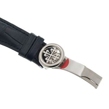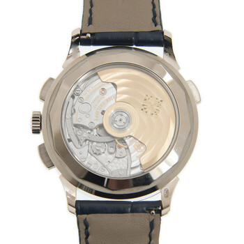 18kt white gold case with a blue alligator leather strap. Fixed 18kt white gold bezel. Blue dial with silver-tone hands and index hour markers. Minute markers. 24 hour markers. world time cities around the outer rim. Dial Type: Analog. Luminescent hands and markers. One subdial displaying: 30 minute. Patek Philippe Calibre CH 28-520 HU Automatic movement, containing 38 Jewels, composed of 343 parts, bitting at 28800 vph, and has a power reserve of approximately 55 hours. Scratch resistant sapphire crystal. Transparent case back. Round case shape, case size: 39.5 mm, case thickness: 12.86 mm. Band width: 20 mm. Fold over clasp. Water resistant at 30 meters / 100 feet. Functions: GMT, second time zone, hour, minute, second, day-night indicator. Additional Info: unsuitable for prolonged contact with water e.g. swimming, bathing. Complications Series. Luxury watch style. Watch label: Swiss Made. Patek Philippe Complications Automatic Blue Dial Men's Watch 5930G-010.