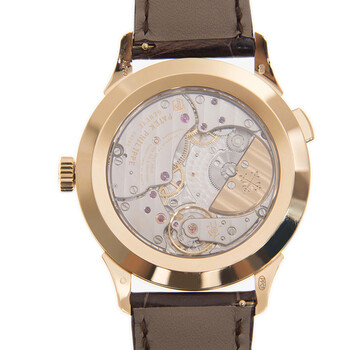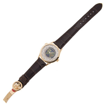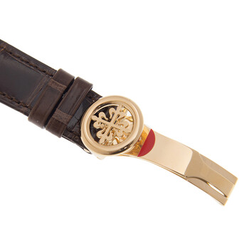 Yellow gold-tone 18kt yellow gold case with a brown leather strap. Fixed yellow gold-tone 18kt yellow gold bezel. White dial with yellow gold-tone hands and Arabic numeral hour markers. Minute scale around the inner rim. Dial Type: Analog. Date display around the inner rim. Two sub-dials displaying: word time and day/night indicator. Patek Philippe Calibre 240 HU Automatic movement, based upon Patek Philippe 240, containing 33 Jewels, composed of 239 parts, bitting at 21600 vph, and has a power reserve of approximately 48 hours. Scratch resistant sapphire crystal. Screw down crown. Transparent see through case back. Round case shape, case size: 38.5 mm. Fold over clasp. Water resistant at 30 meters / 100 feet. Functions: hour, minute. Complications Series. Luxury watch style. Watch label: Swiss Made. Patek Philippe Complications Automatic White Dial Men's Watch 5231J-001.