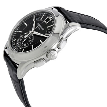 White platinum case with a black alligator leather strap. Fixed white platinum bezel. Black dial with white dauphine-style shape hands and index hour markers. Minute markers around the outer rim. Dial Type: Analog. Annual calendar - date - day of the week - month. One subdial displaying: small second. Patek Philippe Calibre CH 28-250 QA 24H Automatic movement, based upon Patek Philippe CH 28-520 IRM QA 24H, containing 37 Jewels, composed of 402 parts, bitting at 28800 vph, and has a power reserve of approximately 55 hours. Scratch resistant sapphire crystal. Transparent case back. Round case shape, case size: 42 mm. Tang clasp. Water resistant at 30 meters / 100 feet. Functions: annual calendar, chronograph, column wheel, flyback, date, day, hour, minute, second, day/night indicator. Complications Series. Luxury watch style. Watch label: Swiss Made. Patek Philippe Complications Black Dial Annual Calendar Platinum Men's Watch 5905P-010.
