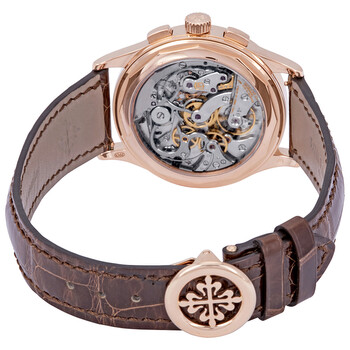 18kt rose gold case with a alligator strap with square scales, hand-stitched, band. Fixed 18kt rose gold bezel. Silver-tone dial with rose gold-tone leaf-style shape hands and Arabic numeral hour markers. Minute markers around the outer rim. Dial Type: Analog. Chronograph - two sub-dials displaying: 60 second and 30 minute. Patek Philippe Calibre CH 29-535 PS Hand Wind movement, containing 33 Jewels, composed of 269 parts, bitting at 28800 vph, and has a power reserve of approximately 65 hours. Scratch resistant sapphire crystal. Sapphire-crystal case back. Round case shape. Case size: 39.4 mm. Fold-over clasp. Water resistant at 30 meters / 100 feet. Functions: chronograph, column wheel, hour, minute, second. Luxury watch style. Watch label: Swiss Made. Patek Philippe Complications Chronograph Men's Watch 5170R/001.
