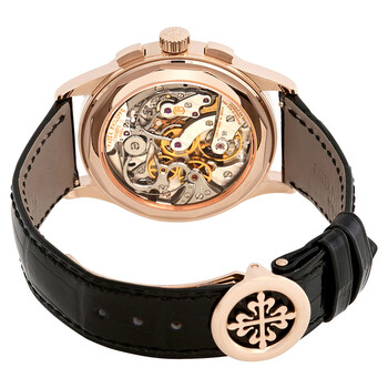 18kt rose gold case with a black (hand-stiched alligator) leather strap. Fixed 18kt rose gold bezel. Ebony black opaline dial with rose gold-tone leaf-style shape hands and Arabic numeral hour markers. Minute markers around the outer rim. Dial Type: Analog. Chronograph - two sub-dials displaying: 60 second and 30 minute. Patek Philippe Calibre CH 29-535 PS Hand Wind movement, containing 33 Jewels, composed of 269 parts, bitting at 28800 vph, and has a power reserve of approximately 65 hours. Scratch resistant sapphire crystal. Screw down crown. Transparent case back. Round case shape, case size: 39.4 mm, case thickness: 8.5 mm. Band width: 22 mm. Fold over clasp. Water resistant at 30 meters / 100 feet. Functions: chronograph, column wheel, hour, minute, second. Additional Info: unsuitable for prolonged contact with water e.g. swimming, bathing. Luxury watch style. Watch label: Swiss Made. Patek Philippe Complications Chronograph Men's Watch 5170R/010.
