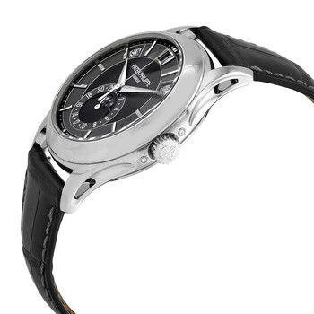 18kt white gold case with a black alligator leather strap. Fixed 18k white gold bezel. Matt black and slate grey dial with silver-tone hands and index hour markers. Minute markers around the outer rim. Dial Type: Analog. Day display between 10 and 11 o'clock position, date display at the 12 o'clock position and month display between 1 and 2 o'clock position. One sub-dial at the 6 o'clock position displaying moonphases and 24 hours subdials. Patek Philippe Calibre 324 S QA LU 24H automatic movement with a 35-45-hour power reserve. Scratch resistant anti-reflective sapphire crystal. Transparent case back. Round case shape. Case size: 40 mm. Tang clasp. Water resistant at 30 meters / 100 feet. Functions: day, date, month, 24 hour, hour, minute, second, moonphases, power reserve indicator. Luxury watch style. Watch label: Swiss Made. Item Variations: 5205G 010, 5205G.010, 5205G010. Patek Philippe Complications Mechanical Black and Grey Dial Men's Watch 5205G-010.
