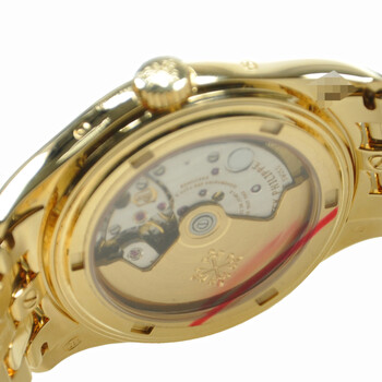 18kt yellow gold case with a yellow gold-tone 18kt yellow gold bracelet. Fixed 18kt yellow gold bezel. Ivory dial with gold-tone leaf-style shape hands and index and Arabic numerals hour markers. Arabic numerals mark the quarter hour positions. minute markers around the outer rim. Dial Type: Analog. Luminescent hands and markers. Day and month indication by hands, date aperture, moon phase. Four sub-dials displaying: day, month, moon-phase and power reserve indicator. Patek Philippe Calibre 324 S IRM QA LU Automatic movement, based upon Patek Philippe 324 S C, containing 36 Jewels, composed of 355 parts, bitting at 28800 vph, and has a power reserve of approximately 45 hours. Scratch resistant sapphire crystal. 18k yellow gold, fluted crown. Sapphire crystal case back. Round case shape, case size: 38 mm, case thickness: 11 mm. Deployment clasp. Water resistant at 25 meters / 80 feet. Functions: annual calendar, moon phase, month, date, day, hour, minute, second, power reserve indicator. Complications Series. Luxury watch style. Watch label: Swiss made. Item Variations: 5146-1J, 51461J, 5146.1J. Patek Philippe Complications Mechanical Ivory Dial Men's Watch 5146/1J-001.