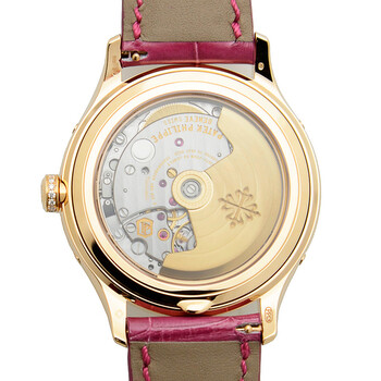 18kt rose gold case with a pink (alligator) leather strap. Fixed 18kt rose gold bezel set with diamonds. Silvery sunburst dial with luminous gold-tone leaf-style hands and Arabic numeral hour markers. Minute markers around the outer rim. Dial Type: Analog. Luminescent hands. Date display at the 6 o'clock position. Three multi-function sub-dials displaying: month, day of the week an moonphase. Patek Philippe calibre 324 S QA LU automatic movement with a 45-hour power reserve. Scratch resistant sapphire crystal. Diamond set crown. Transparent case back. Round case shape. Case size: 38 mm. Case thickness: 11 mm. Strap width: 18 mm. Water resistant at 30 meters / 100 feet. Functions: annual calendar, moon phase, month, date, day, hour, minute, second. Luxury watch style. Watch label: Swiss Made. Patek Philippe Complications Silvery Sunburst Dial 18K Rose Gold Automatic Ladies Watch 4947R-001.