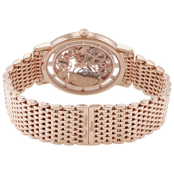 18kt rose gold case with a 18kt rose gold bracelet. Fixed 18kt rose gold bezel. Skeleton dial with silver-tone leaf-style hands and index hour markers. Dial Type: Analog. Patek Philippe calibre 240 automatic movement, containing 27 Jewels, composed of 161 parts, bitting at 21600 vph, and has a power reserve of approximately 48 hours. Scratch resistant sapphire crystal. Screw down crown. Transparent case back. Round case shape. Case size: 39 mm. Case thickness: 6.7 mm. Fold-over clasp. Water resistant at 30 meters / 100 feet. Functions: hour, minute. Additional Info: 27 jewels. Luxury watch style. Watch label: Swiss Made. Patek Philippe Complications Skeleton Dial Automatic Men's 18kt Rose Gold Watch 5180/1R-001.
