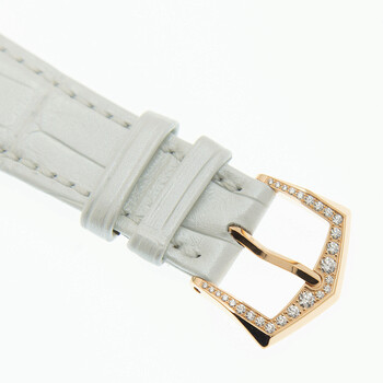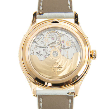 18kt rose gold 347 diamonds (~2.65 ct) case with a white alligator leather strap. Fixed gold-tone bezel with diamond set. White balinese mother of pearl dial with rose gold-tone leaf-style shape hands and Arabic numeral hour markers. Minute markers around the outer rim. Dial Type: Analog. Luminescent hands. Date display at the 6 o'clock position. Three sub-dials displaying: month, day of the week and moonphase. Patek Philippe Calibre 324 S QA LU Automatic movement, containing 34 Jewels, composed of 328 parts, bitting at 28800 vph, and has a power reserve of approximately 45 hours. Scratch resistant sapphire crystal. 14 diamonds (~0.06 ct) crown. Transparent case back. Round case shape, case size: 38 mm. Buckle 27 diamonds (~0.21 ct) clasp. Water resistant at 30 meters / 100 feet. Functions: annual calendar, moon phase, month, date, day, hour, minute, second. Additional Info: case set with 347 diamonds (~2.65 ct), crown set with 14 diamonds (~0.06 ct), buckle set with 27 diamonds (~0.21 ct). Complications Series. Luxury watch style. Watch label: Swiss Made. Patek Philippe Complications White Balinese Mother Of Pearl Dial Automatic Ladies Watch 4948R-001.