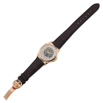 Gold-tone 18kt rose gold case with a brown alligator band. Fixed gold-tone 18kt rose gold bezel. Enamel dial with gold-tone hands. Dial Type: Analog. Word time, day/night indicator subdials. Patek Philippe Calibre 240 HU automatic movement with a 48-hour power reserve. Scratch resistant sapphire crystal. Screw down crown. Sapphire-crystal case back. Round case shape, case size: 39.5 mm, case thickness: 10.61. Fold over clasp. Water resistant at 30 meters / 100 feet. Functions: world time, GMT, second time zone, hour, minute, day/night indicator. Luxury watch style. Watch label: Swiss Made. Patek Philippe Complications World Time Automatic Men's Watch 5131R-011.