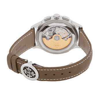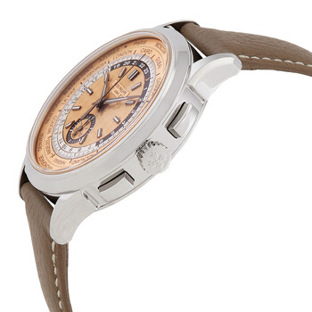 Silver-tone stainless steel case with a taupe calfskin band. Fixed silver-tone stainless steel bezel. Rose-gilt opaline dial with charcoal gray hands and index hour markers. Minute markers around the outer rim. Dial Type: Analog. Luminescent hands and markers. One subdial displaying: 30 minute. Patek Philippe Calibre CH 28-520 HU Automatic movement, containing 38 Jewels, composed of 343 parts, bitting at 28800 vph, and has a power reserve of approximately 55 hours. Scratch resistant sapphire crystal. Transparent case back. Round case shape, case size: 41 mm, case thickness: 12.75 mm. Fold-over clasp. Water resistant at 30 meters / 100 feet. Functions: world time, GMT, second time zone, hour, minute, second, day/night indicator. Complications Series. Luxury watch style. Watch label: Swiss Made. Patek Philippe Complications World Time Automatic Rose Dial Men's Watch 5935A-001.