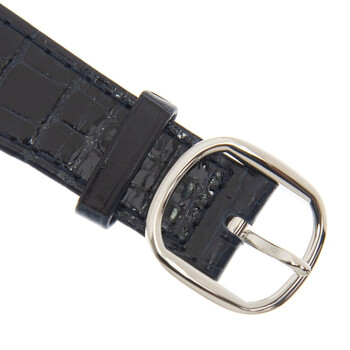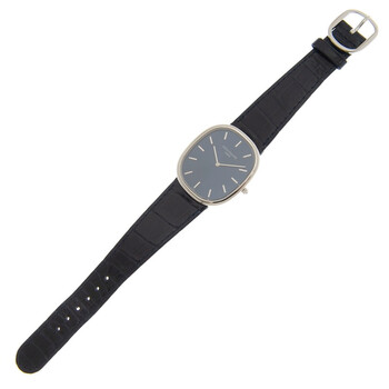 White platinum case with a navy blue alligator band. Fixed white platinum bezel. Blue sunburst dial with silver-tone hands and index hour markers. Dial Type: Analog. Patek Philippe Calibre 240 Automatic movement, containing 27 Jewels, composed of 161 parts, bitting at 21600 vph, and has a power reserve of approximately 48 hours. Pull / push crown. Solid case back. Cushion case shape, case size: 34.5 × 39.5 mm, case thickness: 5.9 mm. Band width: 15 mm. Buckle clasp. Water resistant at 30 meters / 100 feet. Functions: hour, minute. Additional Info: 27 jewels. Golden Ellipse Series. Luxury watch style. Watch label: Swiss Made. Patek Philippe Golden Ellipse Automatic Men's Watch 5738P-001.