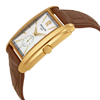 18kt yellow gold case with a brown alligator leather strap. Fixed 18kt yellow gold bezel. Silver dial with gold hands and index hour markers. An Arabic numeral appears at the 12 o'clock position. Minute markers around the outer rim. Dial Type: Analog. Small seconds sub-dial at the 6 o'clock position. Manual wind movement with a 44-hour power reserve. Scratch resistant sapphire crystal. Push / pull crown. Transparent case back. Case dimensions: 33.4 mm x 43 mm. Case thickness: 7.5 mm. Rectangle case shape. Tang clasp. Water resistant at 30 meters / 100 feet. Functions: hour, minute, second. Luxury watch style. Watch label: Swiss Made. Patek Philippe Gondolo Silver Dial Yellow Gold Leather Men's Watch 5124J-001.