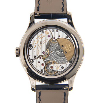 18kt white gold case with a blue alligator leather strap. Fixed 18kt white gold bezel. Royal blue sunburst dial with white leaf-style shape hands and Arabic numeral hour markers. Minute markers around the outer rim. Dial Type: Analog. Date display at the 6 o'clock position. Three- date (inner moonphase), month, day of the week (inner leap year) subdials. Patek Philippe Calibre 240 Q Automatic movement, containing 27 Jewels, composed of 275 parts, bitting at 21600 vph, and has a power reserve of approximately 48 hours. Scratch resistant sapphire crystal. Skeleton transparent exhibition see through case back. Round case shape. Case size: 39 mm. Water resistant at 30 meters / 100 feet. Functions: leap year, month, date, day, hour, minute, second, moonphase, GMT, perpetual calendar, grand complication. Luxury watch style. Watch label: Swiss Made. Patek Philippe Grand Complication Royal Blue Sunburst Dial Men's 18 Carat White Gold Watch 5327G.