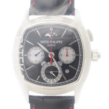 White platinum case with a black alligator leather strap. Fixed white platinum bezel. Black dial with silver-tone leaf-style shape hands and index hour markers. Minute markers around the outer rim. Dial Type: Analog. Perpetual calendar. Four sub-dials displaying: 60 minute, 60 second, date, moonphase. Patek Philippe Calibre CHR 27-525 PS Q Hand Wind movement, containing 27 Jewels, bitting at 28800 vph, and has a power reserve of approximately 48 hours. Scratch resistant sapphire crystal. Screw down crown. Transparent case back. Cushion case shape, case size: 37.3 mm. Tang clasp. Water resistant at 30 meters / 100 feet. Functions: perpetual calendar, leap year, chronograph, column wheel, rattrapante, monopoussoir, month, date, day, hour, minute, small second, day/night indicator. Additional Info: original box, international warranty card, manual (complete accessories). Grand Complications Series. Luxury watch style. Watch label: Swiss Made. Patek Philippe GRAND COMPLICATIONS Automatic Black Dial Watch 5951P-001.
