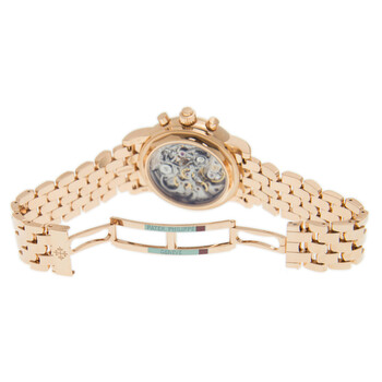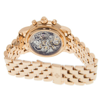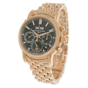 18kt rose gold case with a rose gold-tone 18kt rose gold bracelet. Fixed 18kt rose gold bezel. Black dial with rose gold-tone hands and index hour markers. Minute markers around the outer rim. Dial Type: Analog. Luminescent hands and markers. Perpetual calendar. Chronograph - three sub-dials displaying: 60 second, 60 minute and date/moonphase. Patek Philippe Calibre CHR 29-535 PS Q Hand Wind movement, based upon Patek Philippe CH 29-535 PS Q, containing 34 Jewels, composed of 496 parts, bitting at 28800 vph, and has a power reserve of approximately 65 hours. Scratch resistant sapphire crystal. Transparent case back. Round case shape, case size: 40 mm, case thickness: 14.3 mm. Water resistant at 30 meters / 100 feet. Functions: chronograph, hour, minute, second, split seconds, perpetual calendar. Luxury watch style. Watch label: Swiss Made. Patek Philippe Grand Complications Black Dial Men's Watch 5204/1R-001.